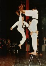 Extrembruchtest: Fauststoß auf acht Porenbetonsteine anlässlich einer Vorführung im Schulzentrum Lintorf 1987. |